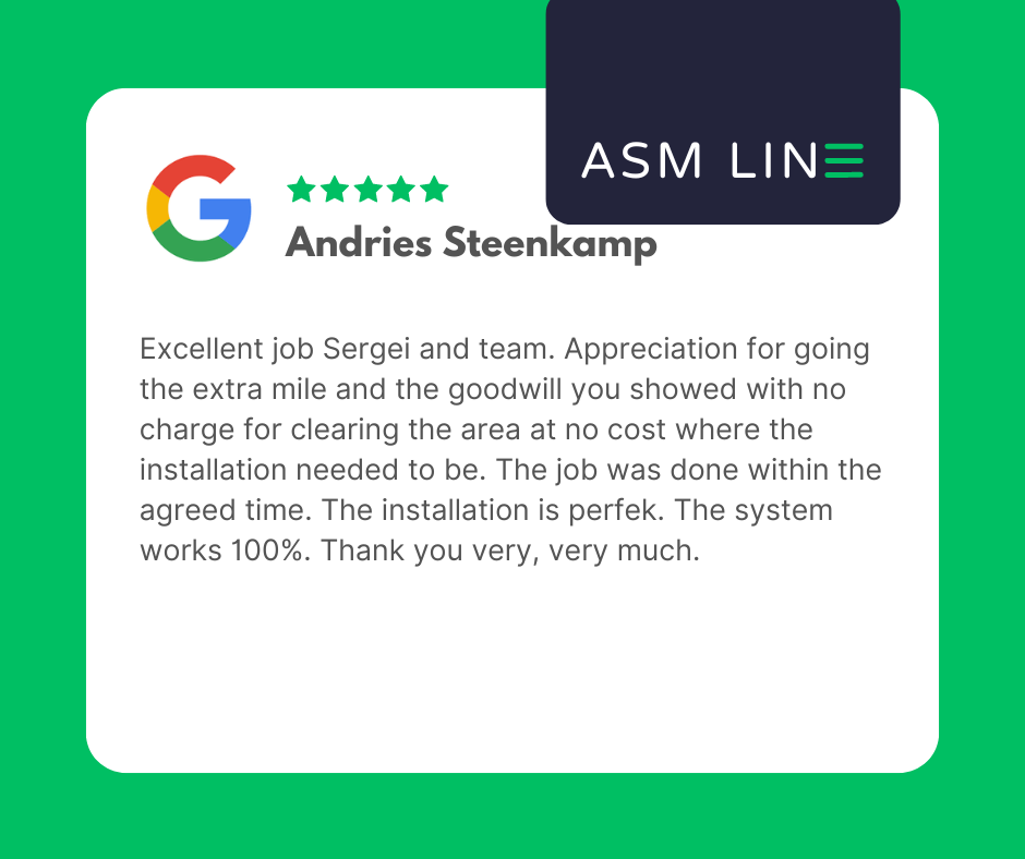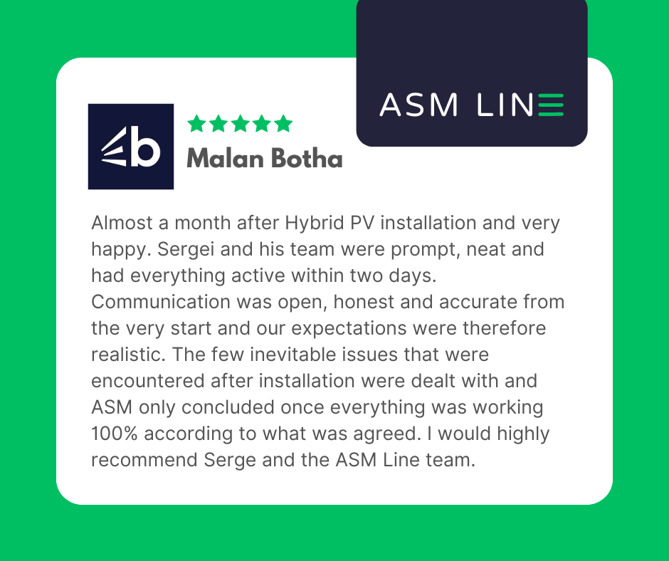 Almost a month after Hybrid PV installation and very happy. Sergei and his team were prompt, neat and had everything active within two days. Communication was open, honest and accurate from the very start and our expectations were therefore realistic. The few inevitable issues that were encountered after installation were dealt with and ASM only concluded once everything was working 100% according to what was agreed. I would highly recommend Serge and the ASM Line team.