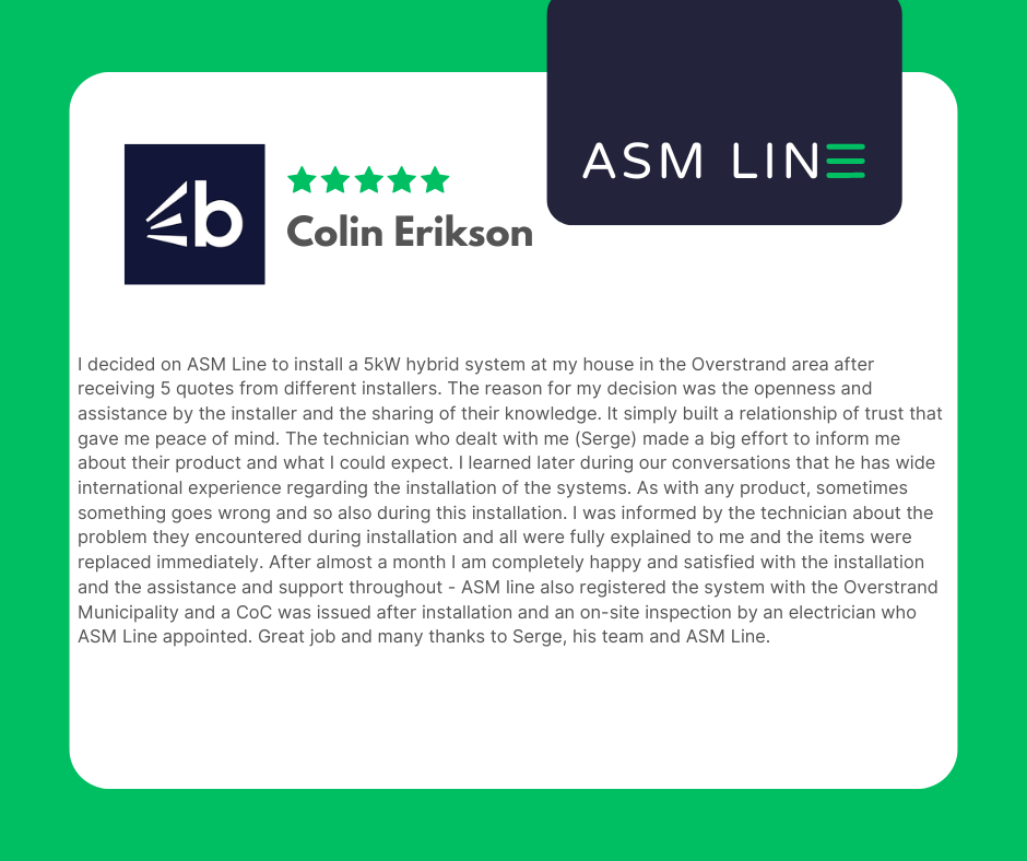 I decided on ASM Line to install a 5kW hybrid system at my house in the Overstrand area after receiving 5 quotes from different installers. The reason for my decision was the openness and assistance by the installer and the sharing of their knowledge. It simply built a relationship of trust that gave me peace of mind. The technician who dealt with me (Serge) made a big effort to inform me about their product and what I could expect. I learned later during our conversations that he has wide international experience regarding the installation of the systems. As with any product, sometimes something goes wrong and so also during this installation. I was informed by the technician about the problem they encountered during installation and all were fully explained to me and the items were replaced immediately. After almost a month I am completely happy and satisfied with the installation and the assistance and support throughout – ASM line also registered the system with the Overstrand Municipality and a CoC was issued after installation and an on-site inspection by an electrician who ASM Line appointed. Great job and many thanks to Serge, his team and ASM Line.