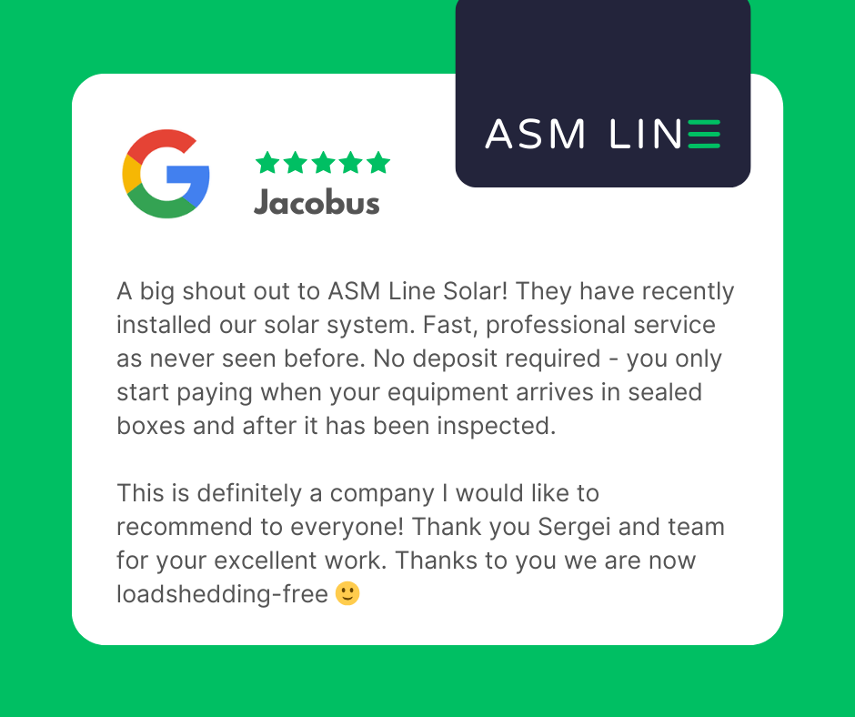 A big shout out to ASM Line Solar! They have recently installed our solar system. Fast, professional service as never seen before. No Deposit required – you only start paying when your equipment arrives in sealed boxes and after it has been inspected.