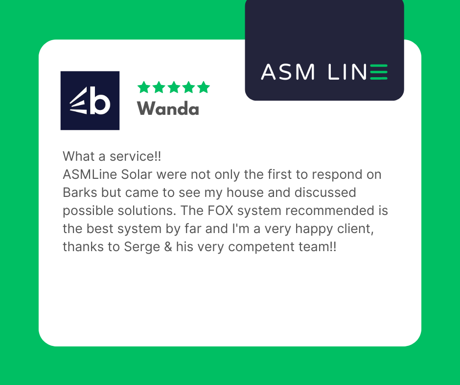 ASMLine Solar were not only the first to respond on Barks but came to see my house and discussed possible solutions. The FOX system recommended is the best system by far and I’m a very happy client, thanks to Serge & his very competent team!!